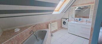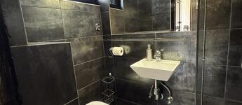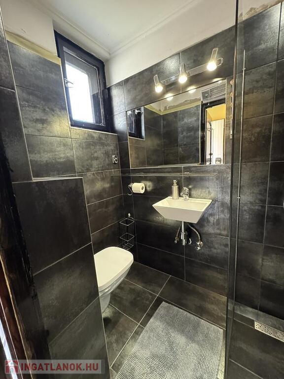 A földszinti fürdőszoba 2024-ben teljes körű felújításon esett át, új burkolatokkal és szaniterekkel.