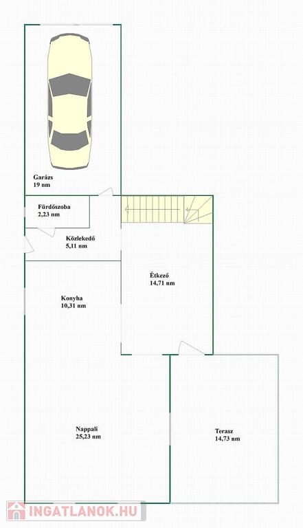 A földszinten egy tágas, kb. 50 m²-es amerikai konyhás nappali–étkező, tároló, zuhanyzós fürdőszoba, valamint nagy belmagasságú, jól pakolható garázs kapott helyet. A nappaliból közvetlen kijárat nyílik a 15 m²-es fedett teraszra.