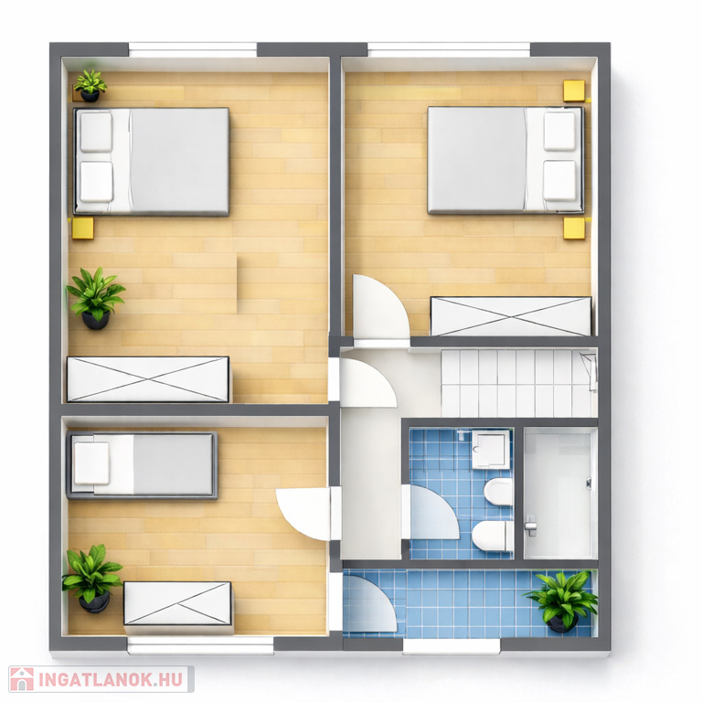 - emeleten: 3 hálószoba, fürdőszoba-WC, erkély