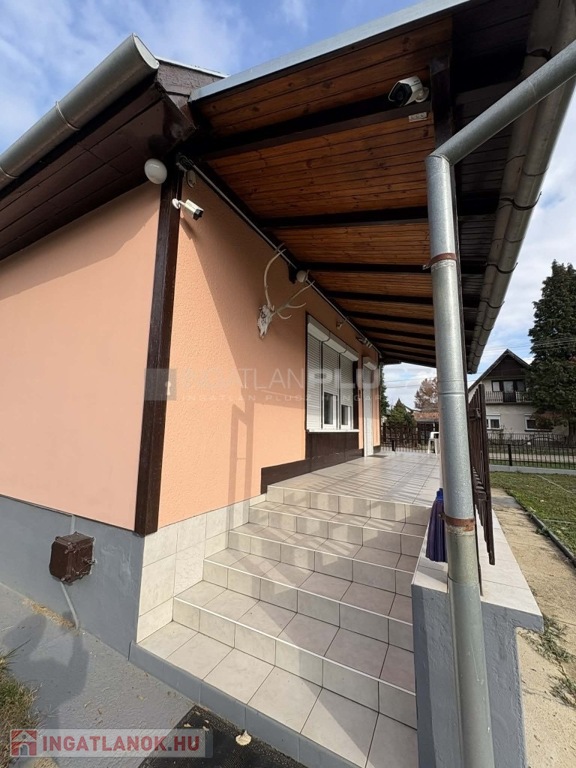 A házat két oldalon végigfutó fedett terasz öleli körbe, továbbá egyállásos garázs, melléképület, tároló és műhely is tartozik hozzá. Az ingatlan teljes egészében alápincézett, amely jelentős plusz tárolóteret biztosít. A vízellátást fúrt kút szolgáltatja.
