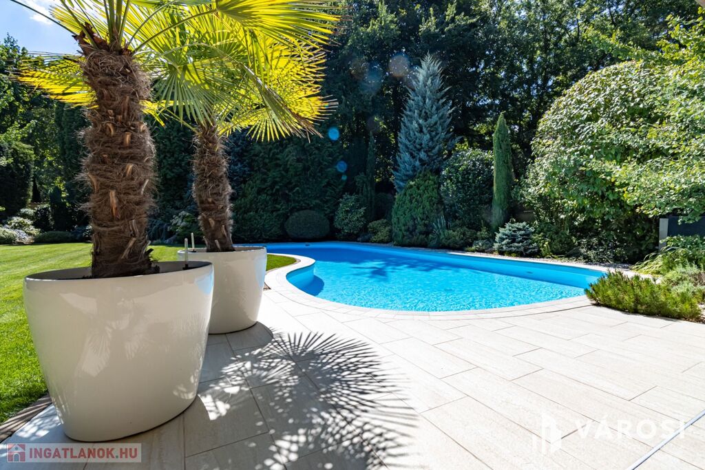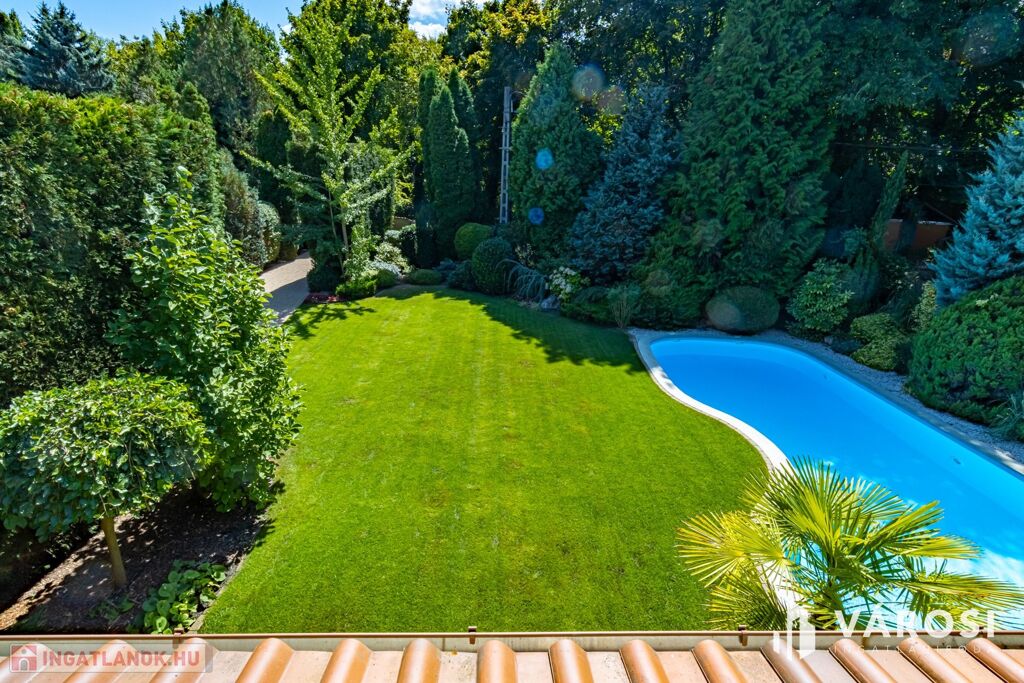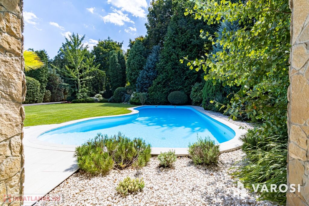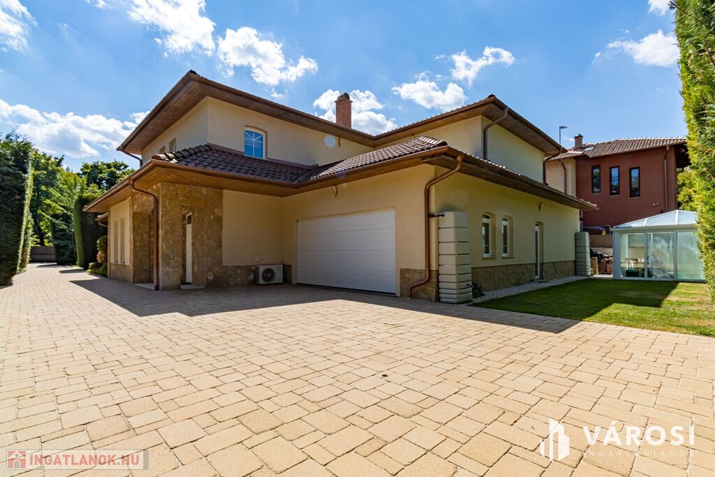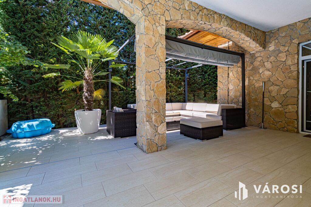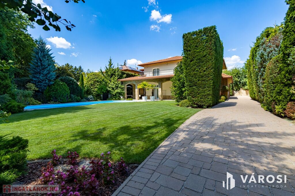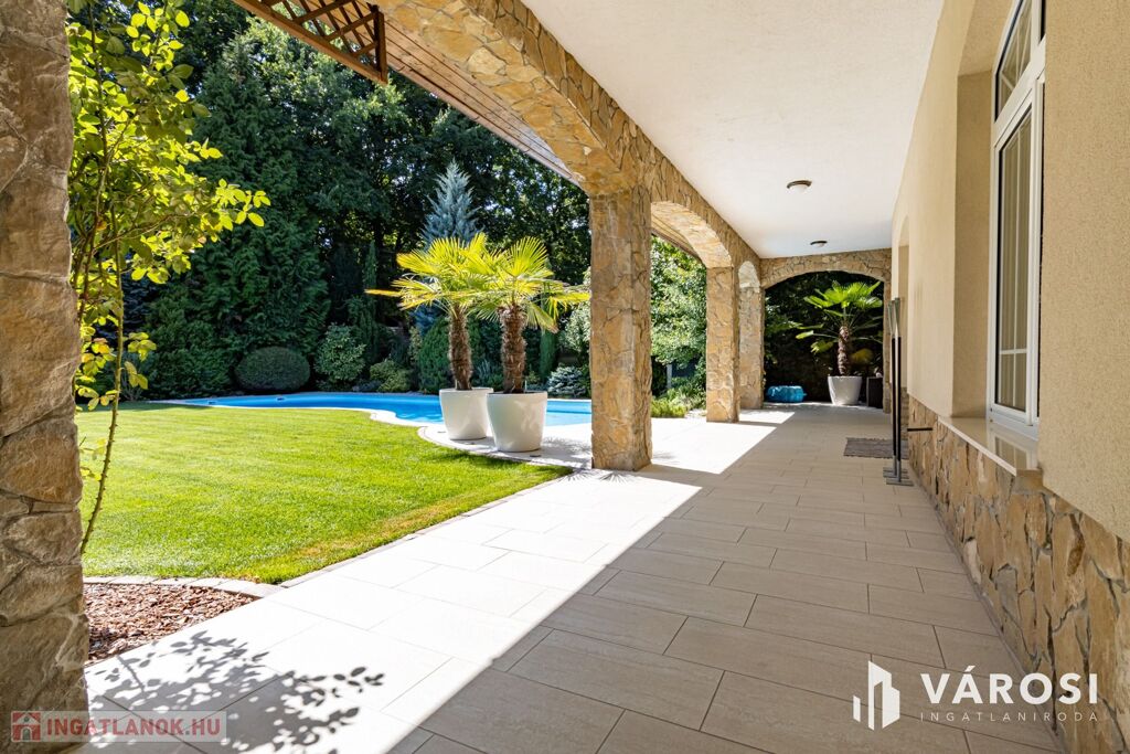Gyönyörűen parkosított 1163 m2-es kertben, 426 m2 össz alapterületű, medencével, dupla garázzsal, kerti társasági sarokkal, nagy teraszokkal rendelkező, hatalmas belső terekkel, klimatizálva, padlófűtéssel, a képeken látható teljes berendezéssel, igényes kivitelezéssel épült mediterrán típusú ingatlan várja új tulajdonosát.