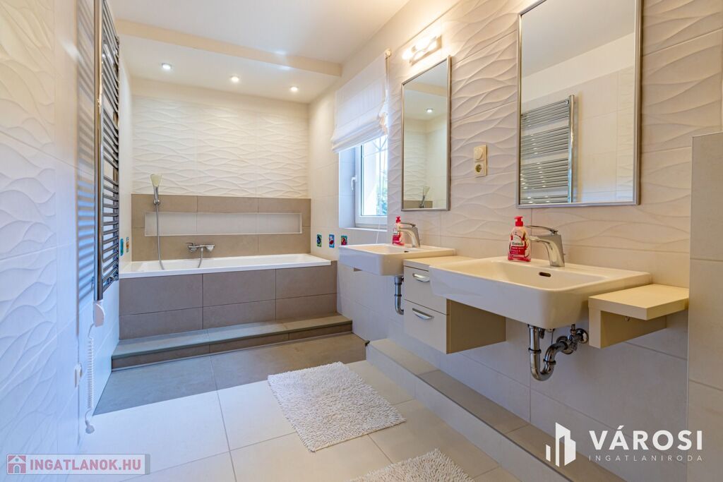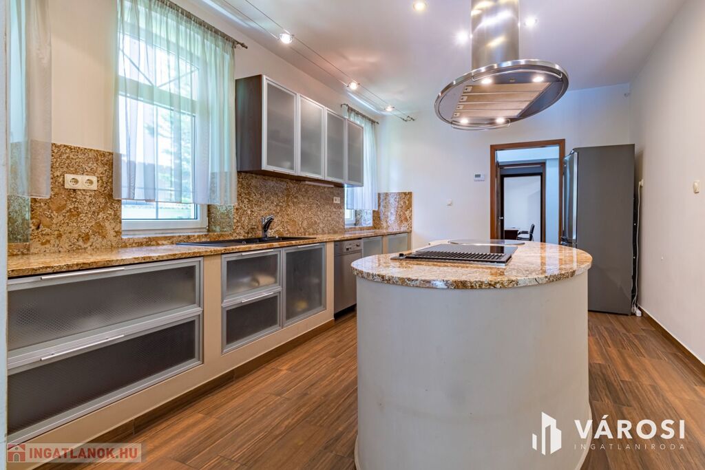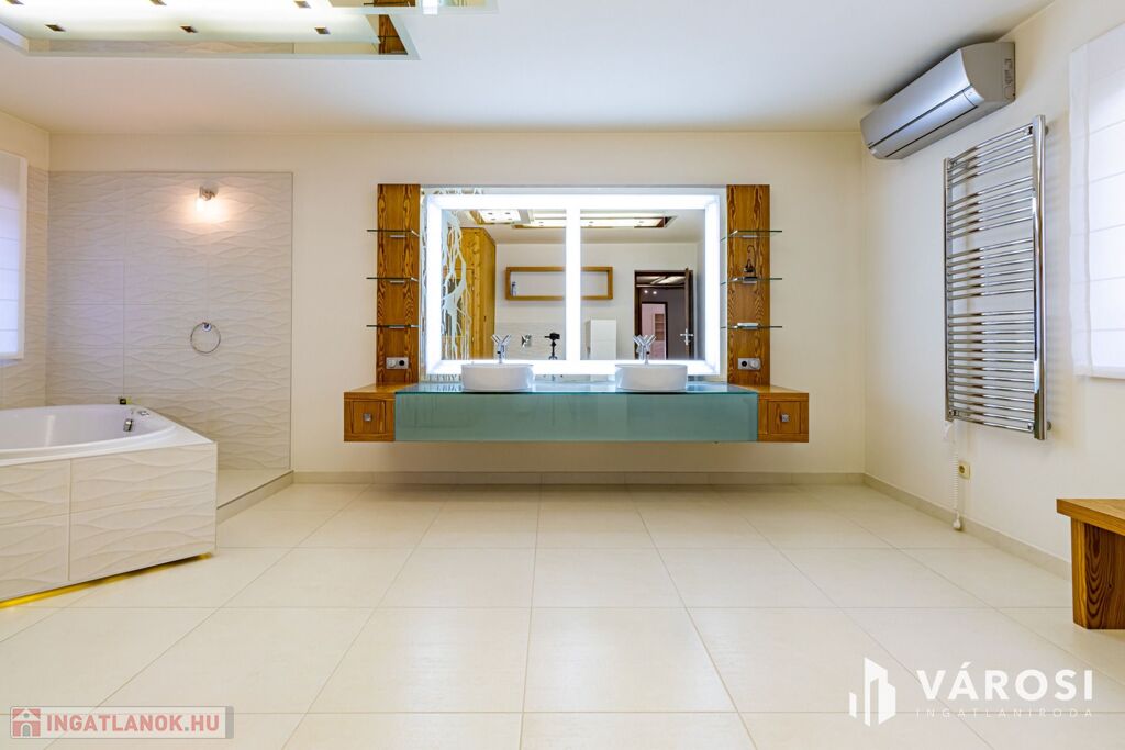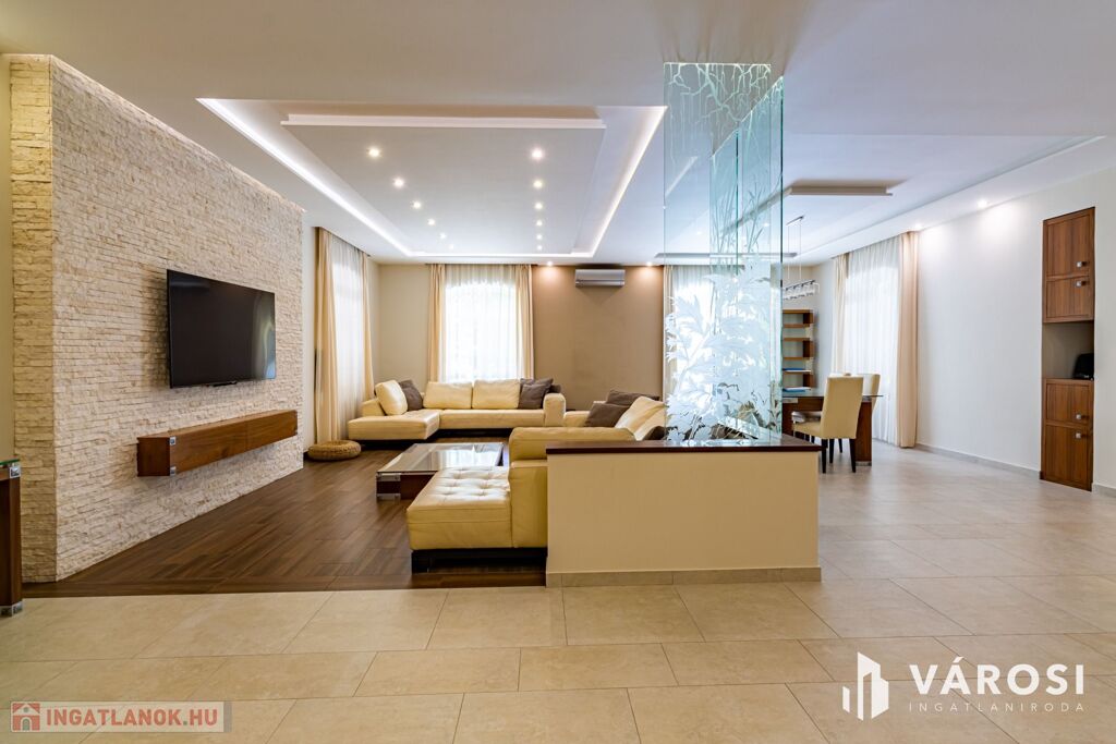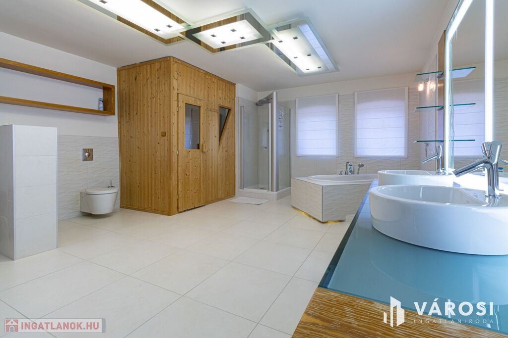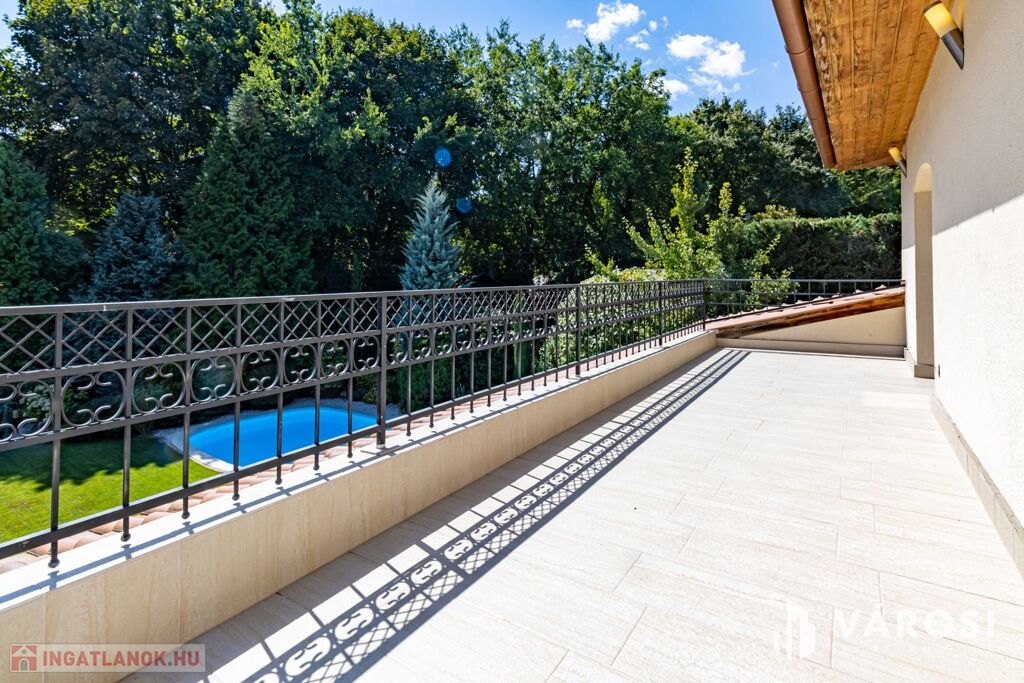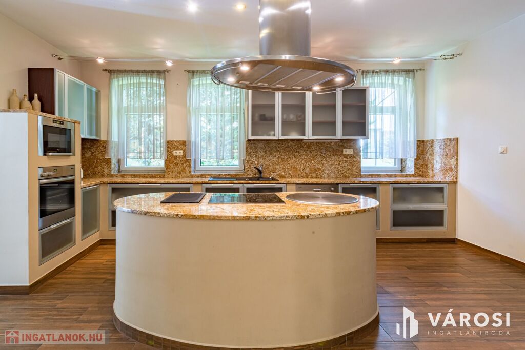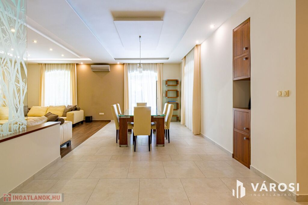 Gyönyörűen parkosított 1163 m2-es kertben, 426 m2 össz alapterületű, medencével, dupla garázzsal, kerti társasági sarokkal, nagy teraszokkal rendelkező, hatalmas belső terekkel, klimatizálva, padlófűtéssel, a képeken látható teljes berendezéssel, igényes kivitelezéssel épült mediterrán típusú ingatlan várja új tulajdonosát.