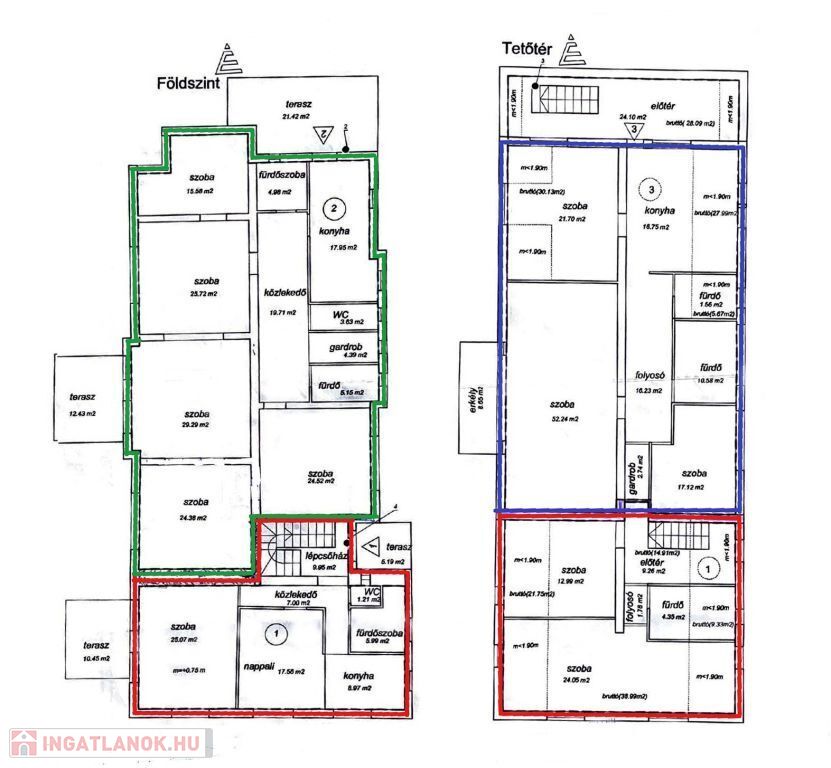 A földszinti lakás 175 nm-es, 5 szobás, két terasszal rendelkező lakás.