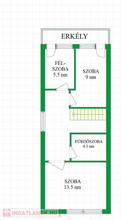 Az emeleten két kényelmes méretű hálószoba, egy félszoba és egy második fürdőszoba található.