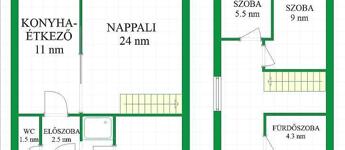 A földszinten tágas nappali, konyha, étkező, hálószoba, fürdő és külön WC kapott helyet.