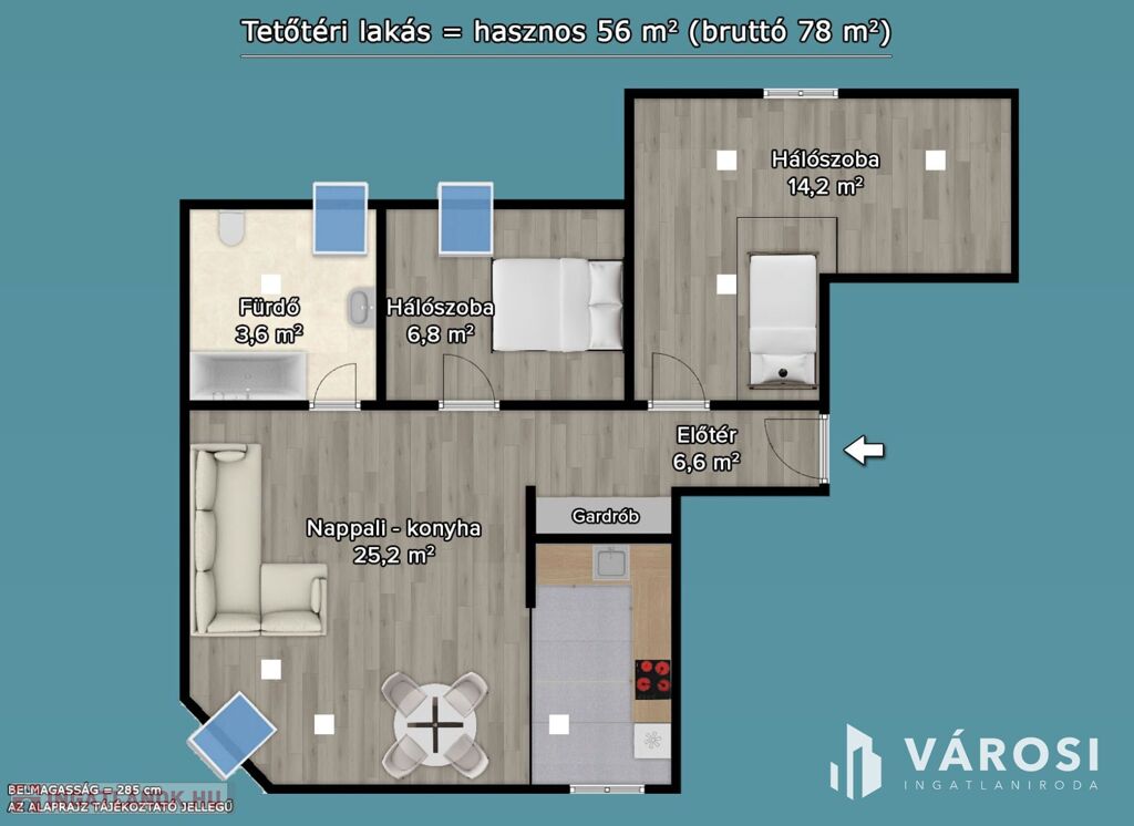 A lakás első emeleti, önálló helyrajzi számmal rendelkezik, nettó alapterülete 56 m2 (a bruttó 78 m2).