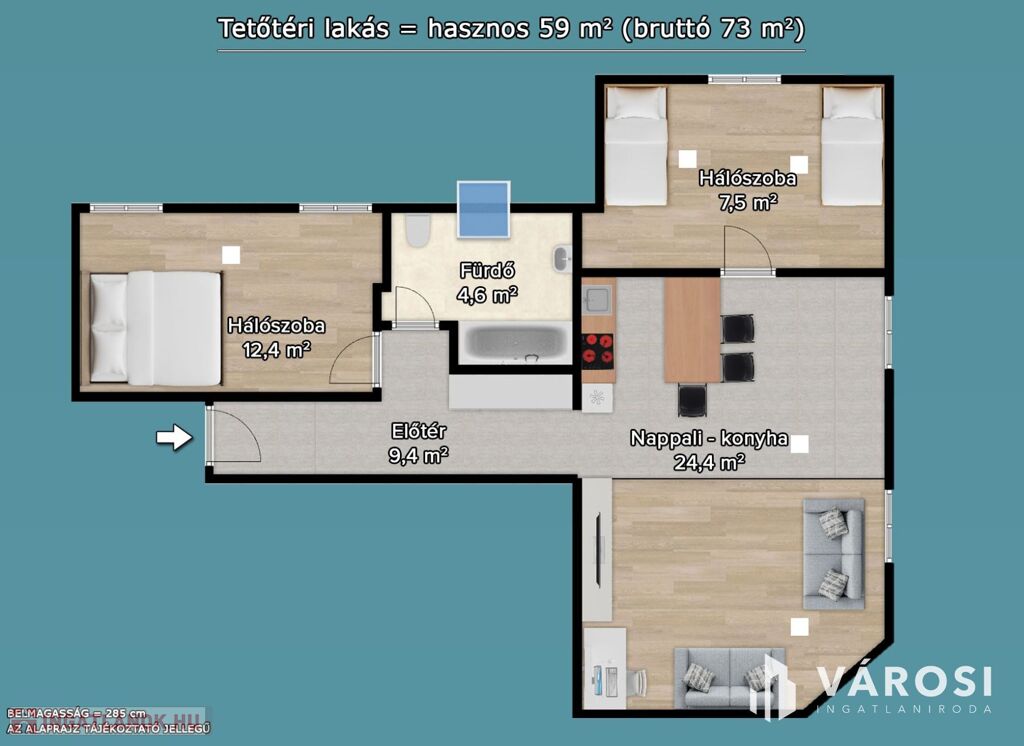 A lakás első emeleti, önálló helyrajzi számmal rendelkezik, nettó alapterülete 59 m2 (a bruttó 73 m2).