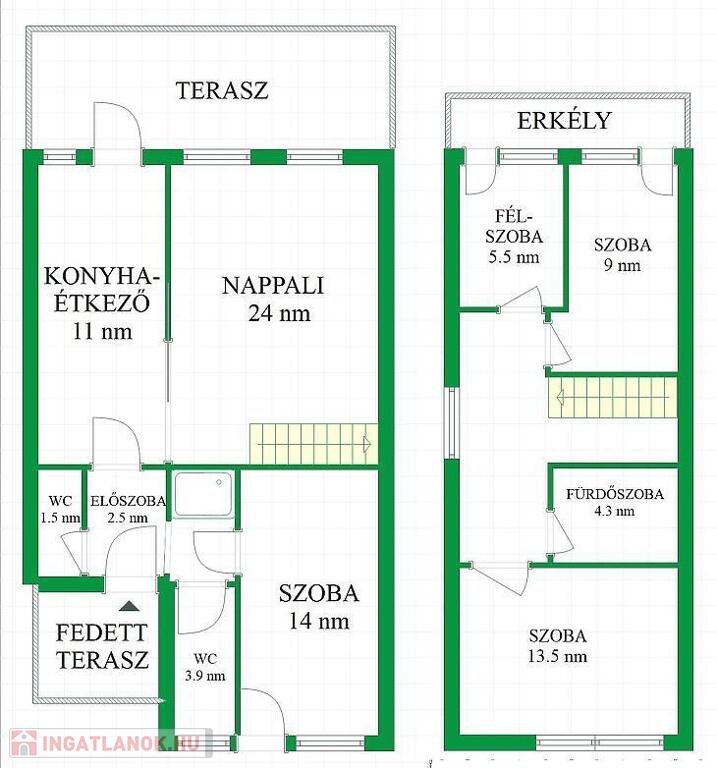 A földszinten tágas nappali, konyha, étkező, hálószoba, fürdő és külön WC kapott helyet.