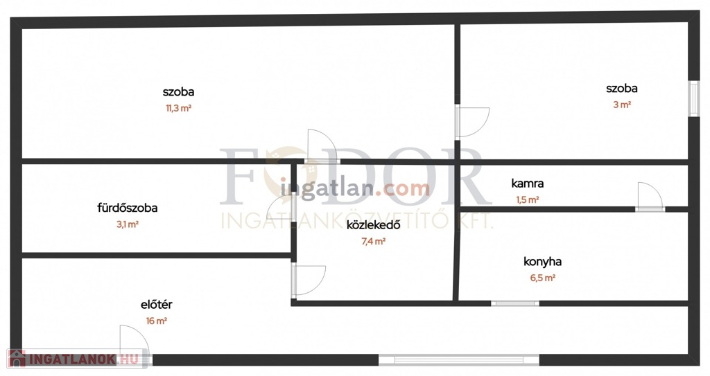 • Lakóépület: 49 m² – két szoba, előszoba, konyha-étkező, fürdő + Wc, kamra