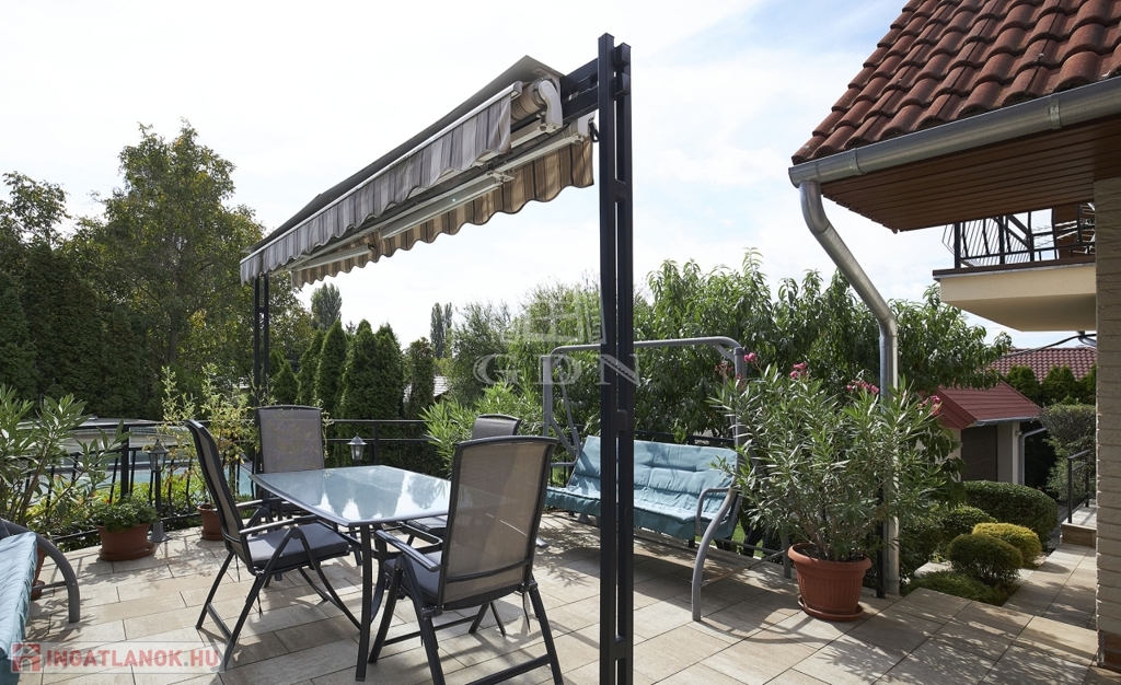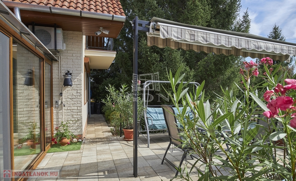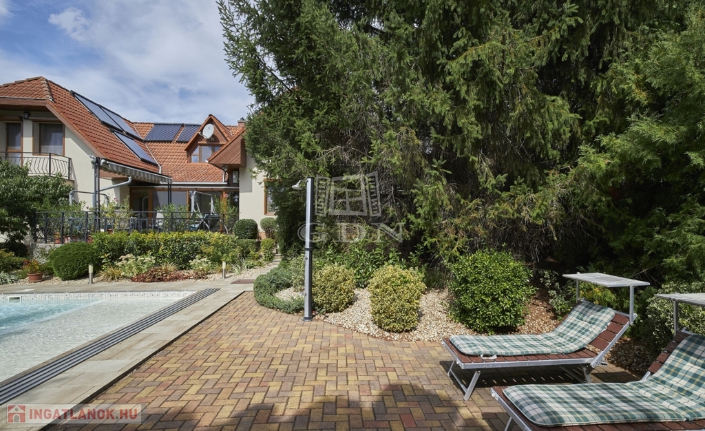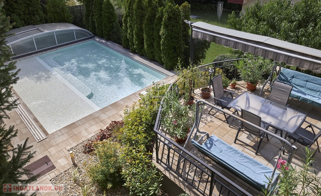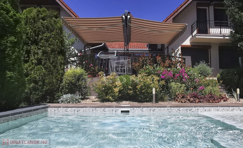 Kertben öntöző rendszer telepített, örökzöld növényekkel parkosított, melyben egy fedett, fűthető úszómedence található.