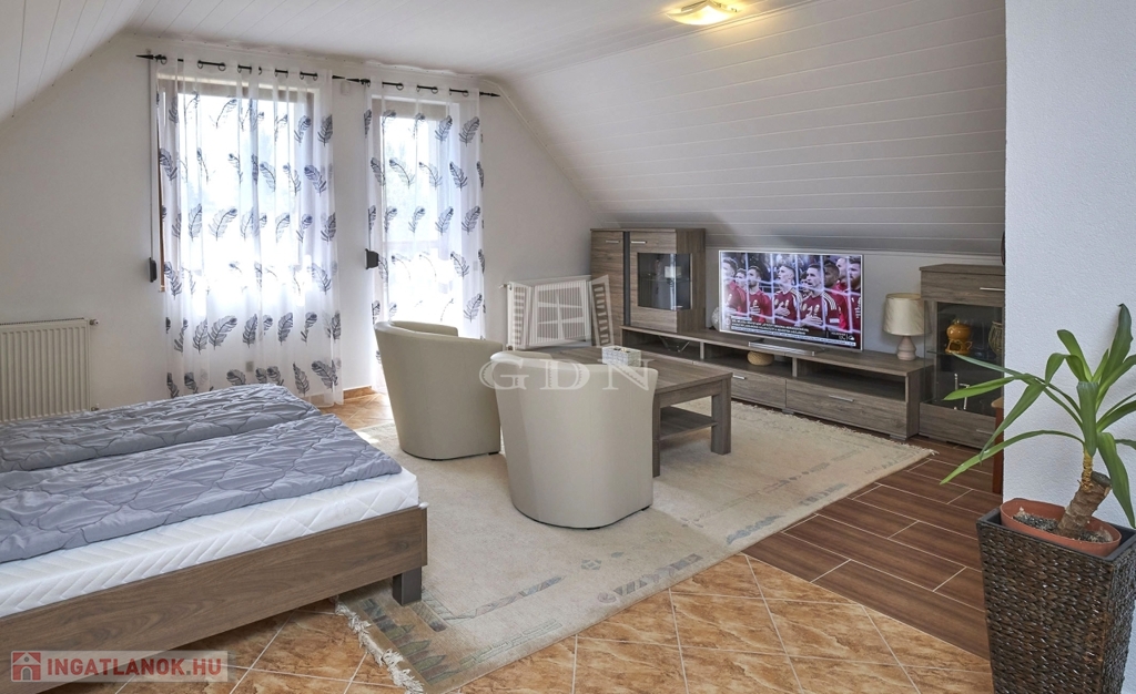 Az emeleti részen iroda, illetve vendégek fogadására alkalmas apartman lakás található, ami külön bejárattal is megközelíthető.