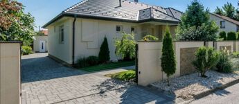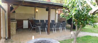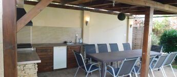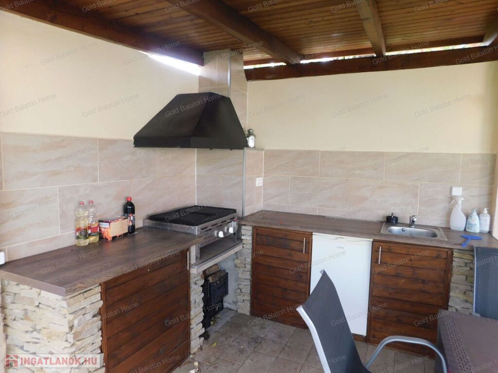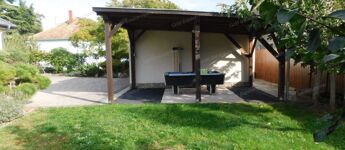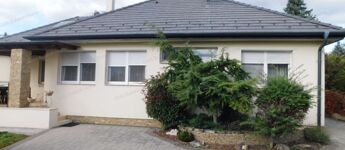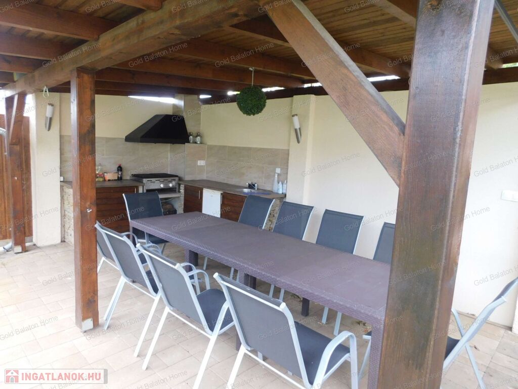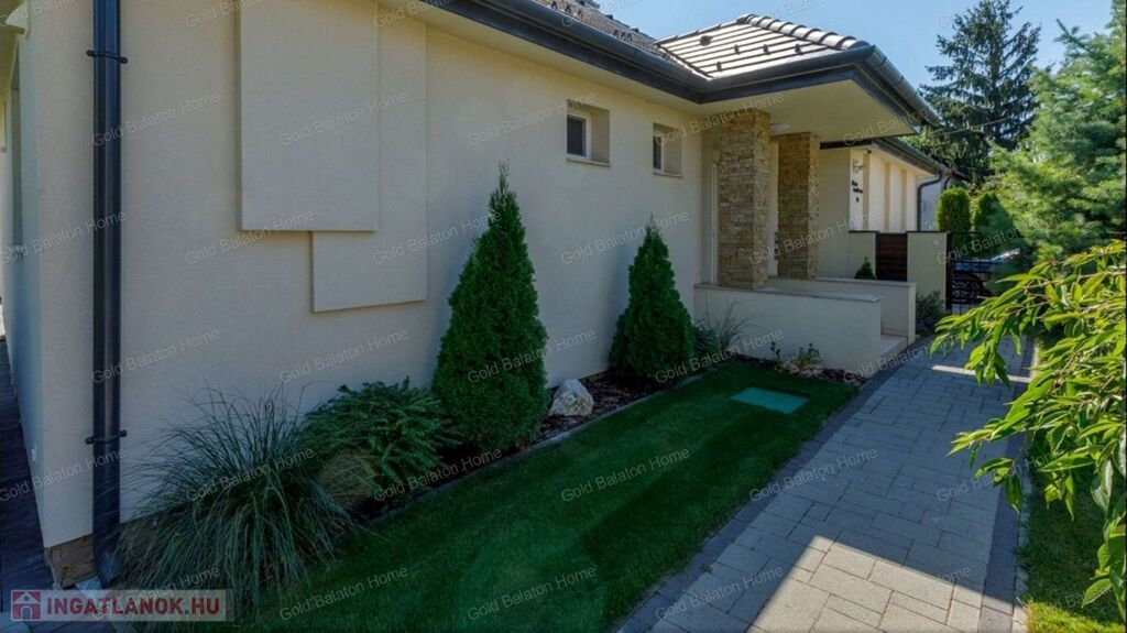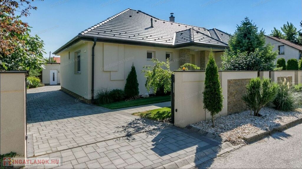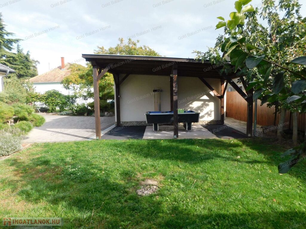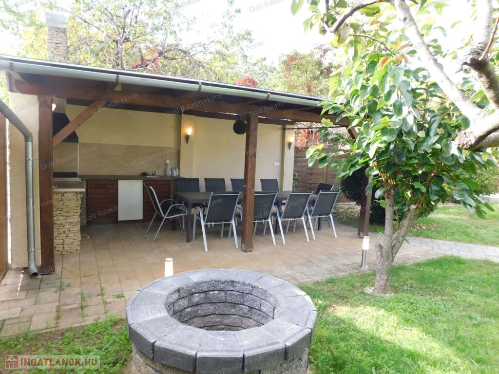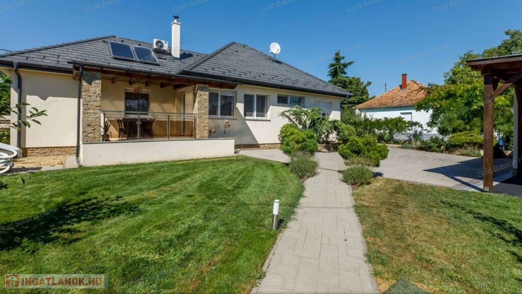 Egyszintes, újszerű CSALÁDI HÁZ 1 nagy nappalival, 4 hálószobával, 2 fürdőszobával, nagy terasszal, játszótérrel, kerti grill konyhával, garázzsal, szép, parkosított udvarral, csendes helyen, a strandtól mindössze 1000 méterre eladó.