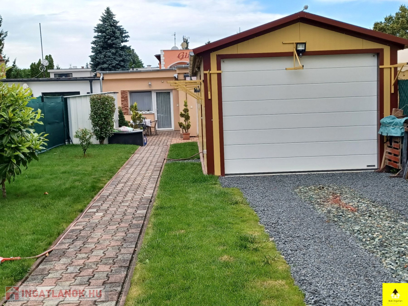 Műszaki adatok. Észak-déli fekvésű. Két utcára néző telek, még további beépítési lehetőséggel, ami jelentős értéknövelő tényező! Telekméret: 421 m2 – es. Beépített terület: 1x 85 m2 – es lakóépület, + 30 m2 – es garázs, ebben toalett, hideg- melegvíz, csatorna van, földgáz is bevezetve és mosoda van kialakítva új gépekkel. Az épület hőszigetelt panelből készült. Vízzáró szigetelt vasbeton alapszerkezetre. Ebben kapott helyet a mosóhelyiség, amiben 14 kg-os mosógép,15 kg-os szárítógép, 85 cm –es vasalógép található. Különálló épület van, ami a kerti szerszám és bicikli tároló