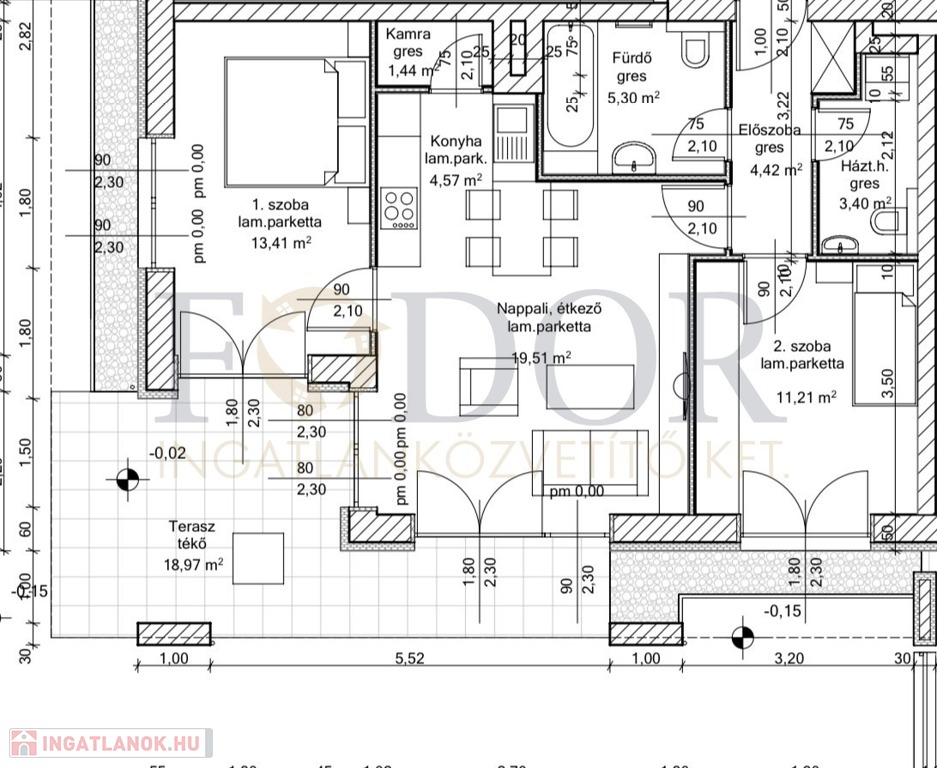 E szemet gyönyörködtető, 63 m²-es földszinti lakás porotherm 38-as téglából készült, és 16 cm-es grafitos szigeteléssel rendelkezik, ami kiváló hőszigetelést biztosít. A lakás kialakítása amerikai konyhás nappali + 2 kényelmes szobával tökéletes lehetőséget kínál a családok számára.