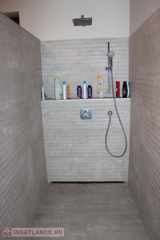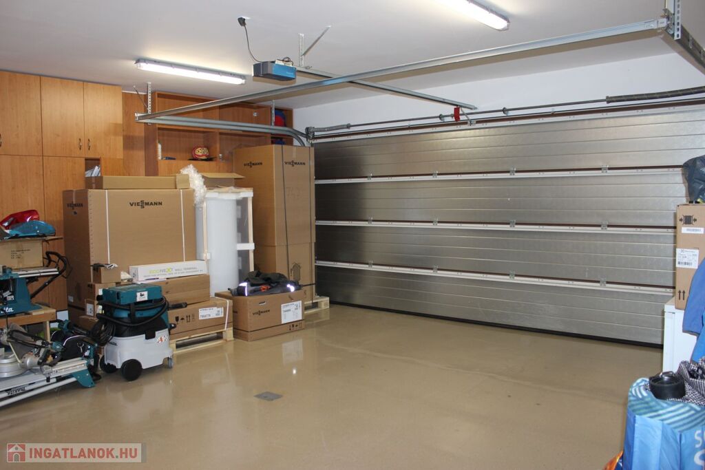 A 40 m2 garázsban található a gépészet nagy része. A duplagarázs műgyanta burkolatot kapott, elektromos Hörmann kapuval felszerelt. Padlófűtéssel rendelkezik, vízvételi lehetőség szintén megoldott.
