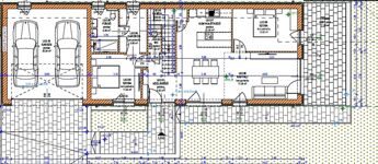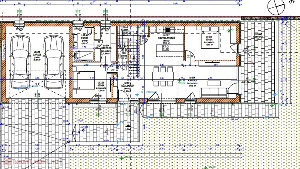 FÖLDSZINT 86,57 m2 : Nappali 17 m2, Konyha - étkező 22,2 m2, 2 háló (11,64 m2, 13,65m2 ), fürdő 5,89 m2 , gardrób 5,98 m2, kamra 2,85 m2, WC 1,52 m2, 5,93 m2 közlekedő.