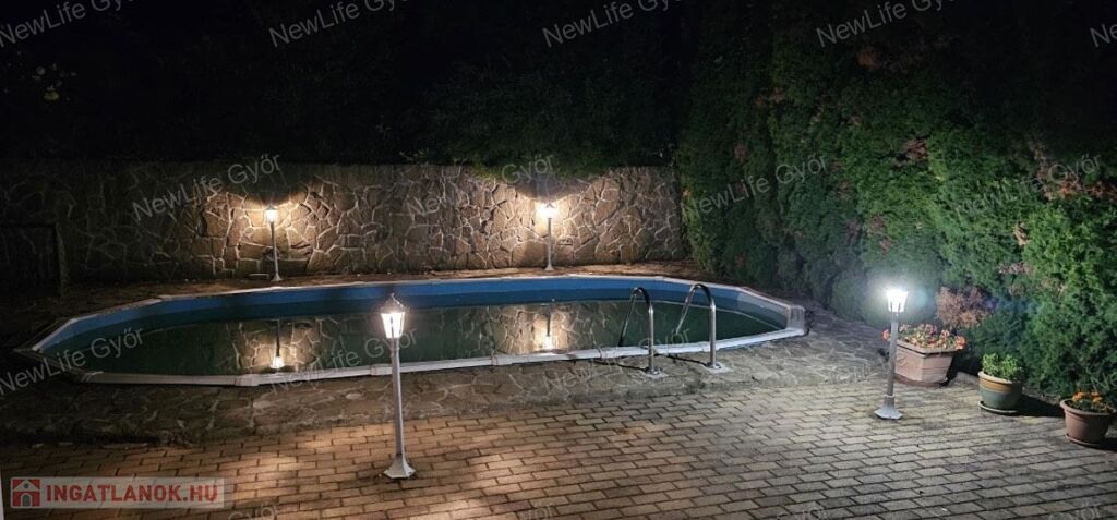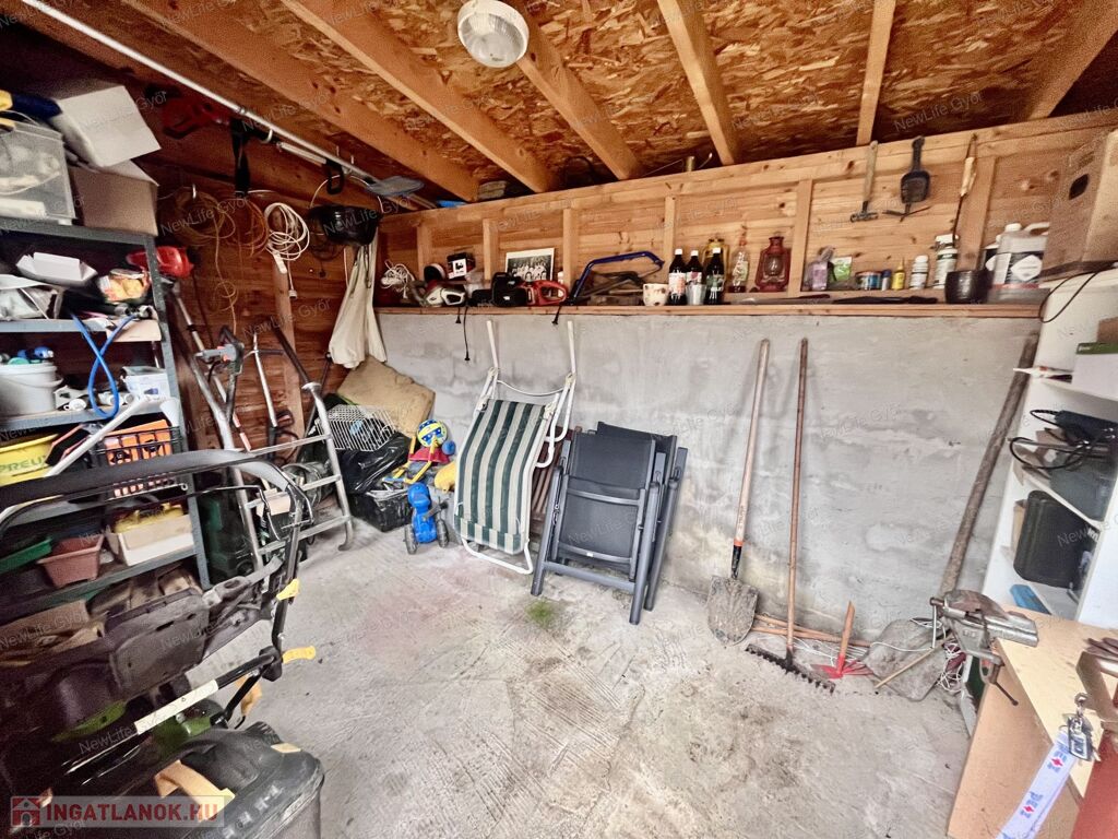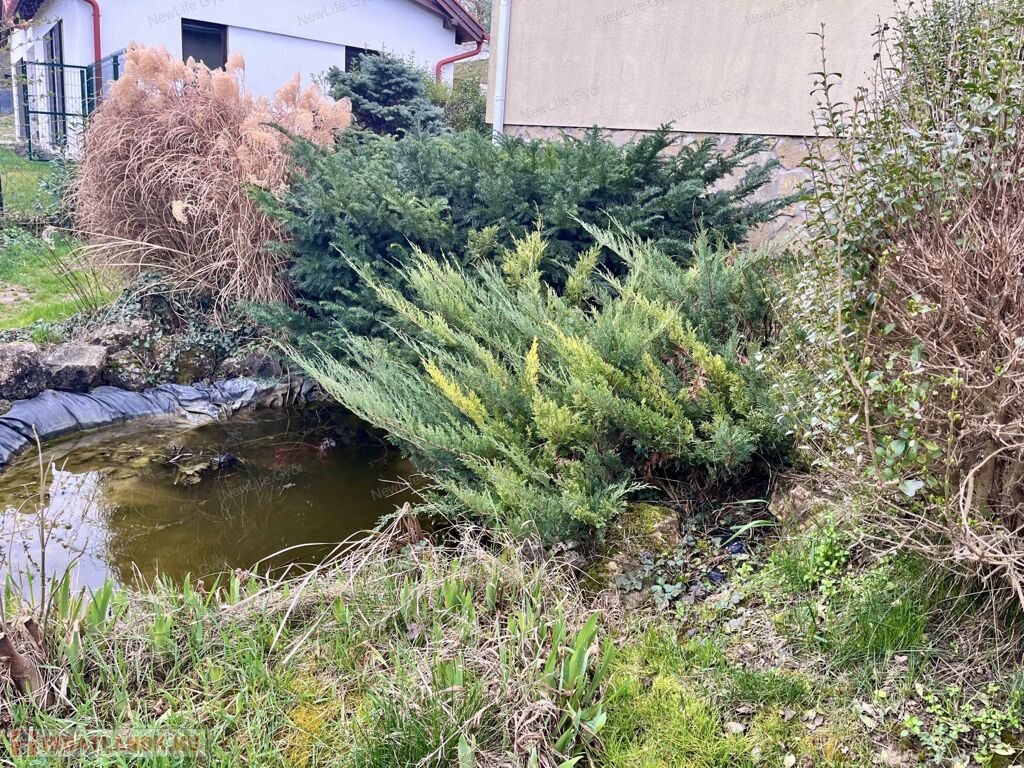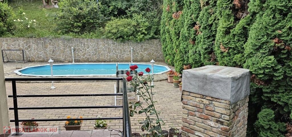 A nappaliból van lehetőség elérni a nagyméretű teraszt és a hátsó kertrészt, ahol egy kerti sütögető/kemence, egy nagyméretű, 1,2m mély medence,és egy 2,5*6 m-es nagyságú kerti ház található. A telek hátsó része fákkal, bokrokkal díszített.