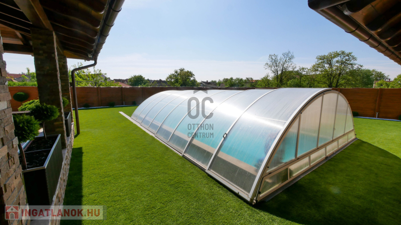 Az egyedileg tervezett kertben értékes és különleges örökzöld dísznövények kaptak helyet a gondozásmentes 5 cm vastagságú holland pázsittal. A kertben található egy 8x4 m-es épített, fedett medence, melynek a tisztítását egy önjáró robot végzi.