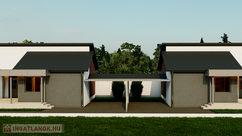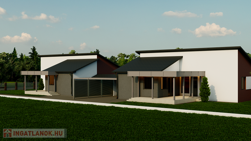 A telekre két ház épül, de semmilyen közös fallal az épületek nem érintkeznek, a két ház között a 18 nm-es fedett gépkocsi beállók helyezkednek el.