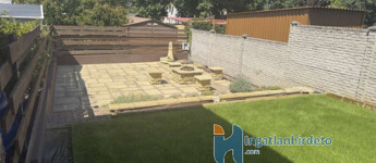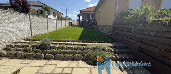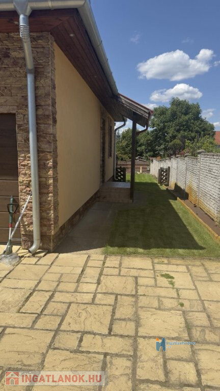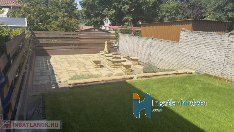 A 16 m²-es garázs közvetlen kapcsolatban áll a lakótérrel, ami a mindennapokban kifejezetten kényelmes. Az udvar rendezett, automata öntözőrendszerrel kialakított, a kertben elkülönített főző- és bográcsozó hely található. Az előkert parkosított, a kerítés jó állapotú.