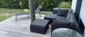 A nappali és a konyha is közvetlenül kapcsolódik a hátsó, fedett 40 négyzetméteres teraszhoz, amely a családi vacsorák és baráti összejövetelek ideális helyszíne.