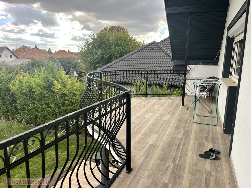 Az emeletre tömörfa lépcső vezet, ahol három hálószoba, egy gardróbszoba, két erkély (egy utcafronti és egy kertre néző), valamint egy nappali pihenősarok kapott helyet. Innen nyílik a beépített tetőtér, amely további szobák kialakítására is alkalmas, jelenleg tárolóként funkcionál.