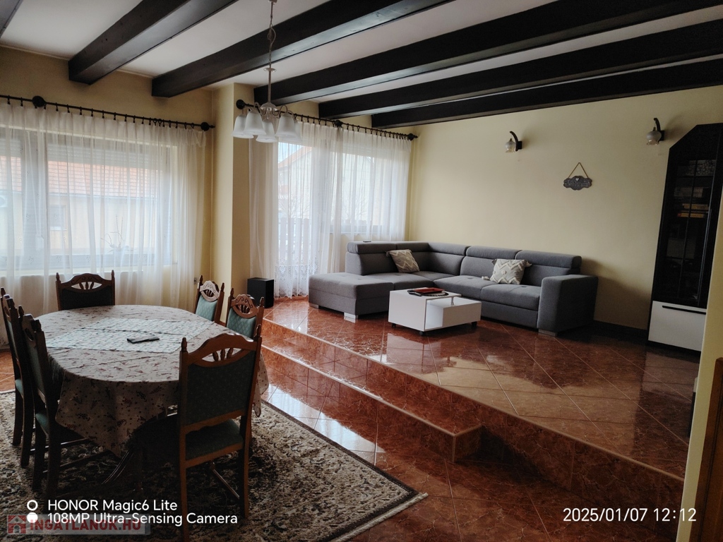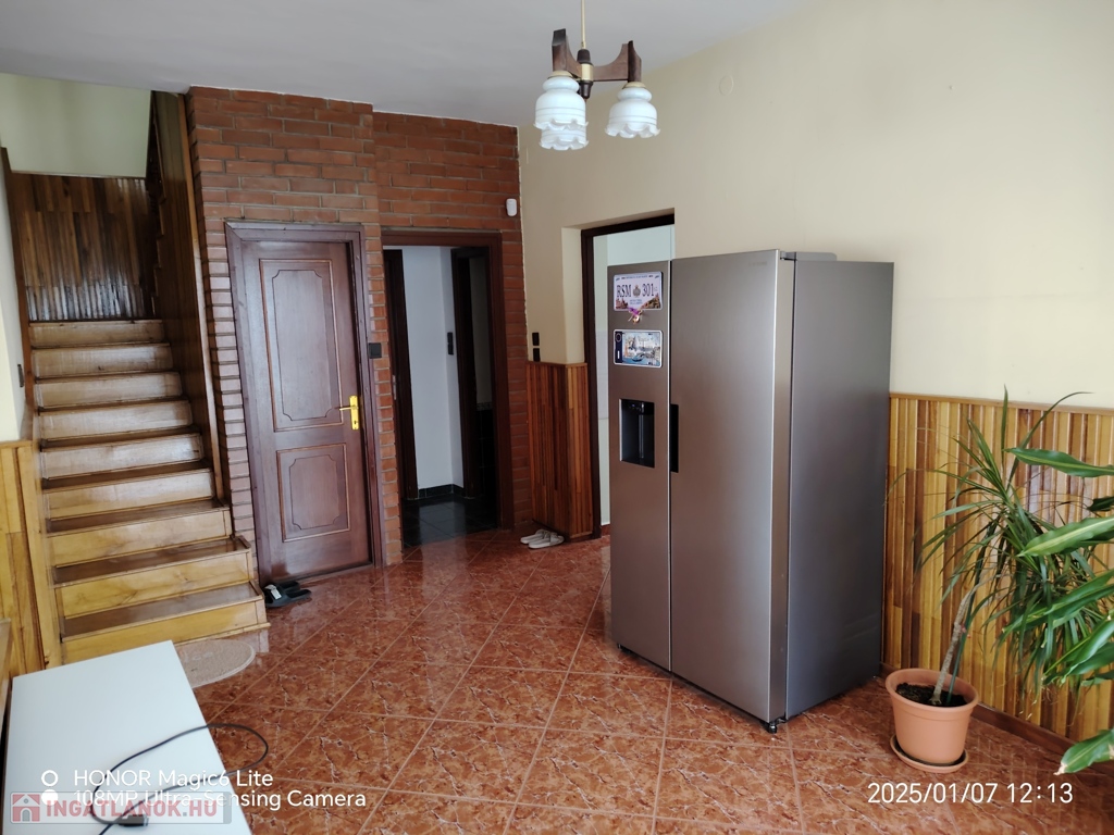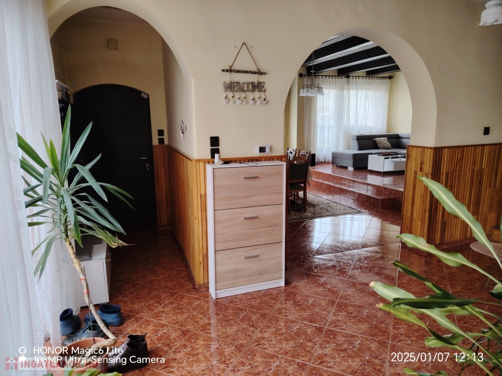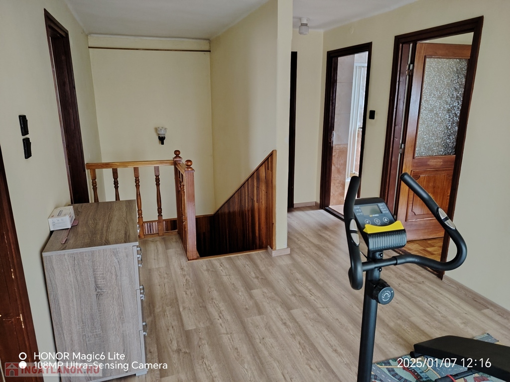 A földszinten (110 m²) nagy nappali( 42m² ), egy hálószoba ( 9 m²), konyha(10,5 m² ), spájz (4 m²), fürdöszoba (duskabin, sarokkád, egy mosdó) ( 7,5 m²), külön wc (1,5 m² ), nagy elötér ( 13,5 m² ) található.