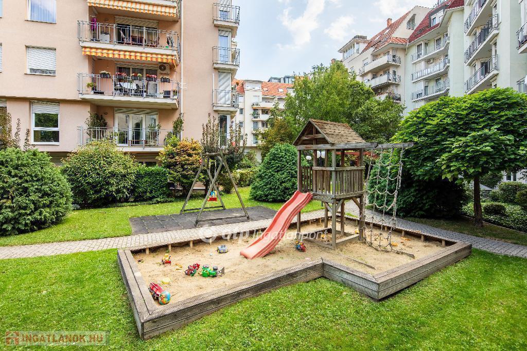 A ház BELSŐ KERTJE valódi oázis a városban: kerti TÓ, padok, játszótér, csúszda, hinta és homokozó várja a lakókat.