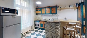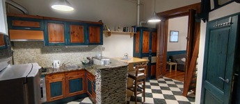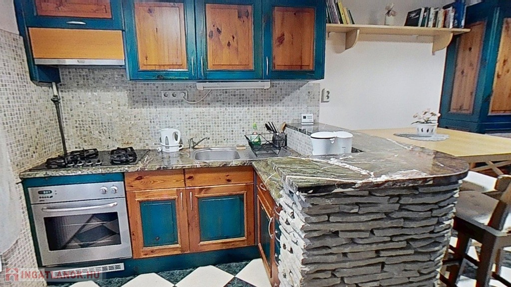 A konyha teljesen felszerelt, a munkapult márvánnyal borított, amely egy szintén márványborítású bárpulttal is ki van egészítve.