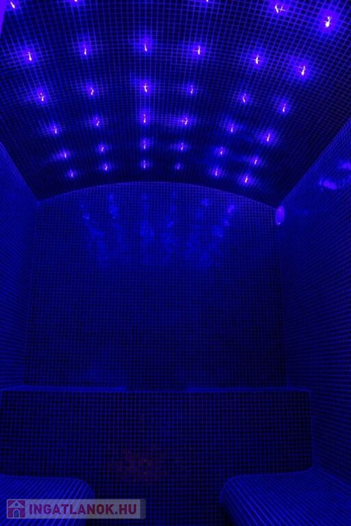 - gőz szauna, az íves plafonján különleges led „ csillag fényes égbolttal), mely színe állítható, teljes belsejét különleges mozaikok díszítik,