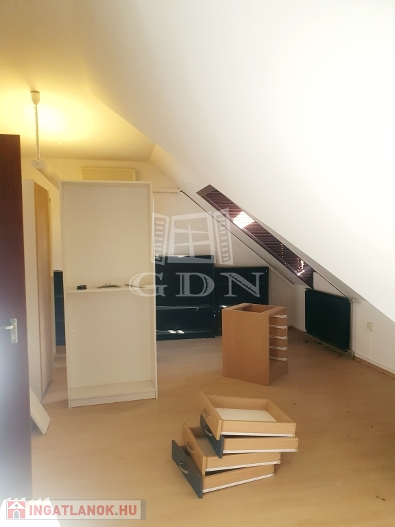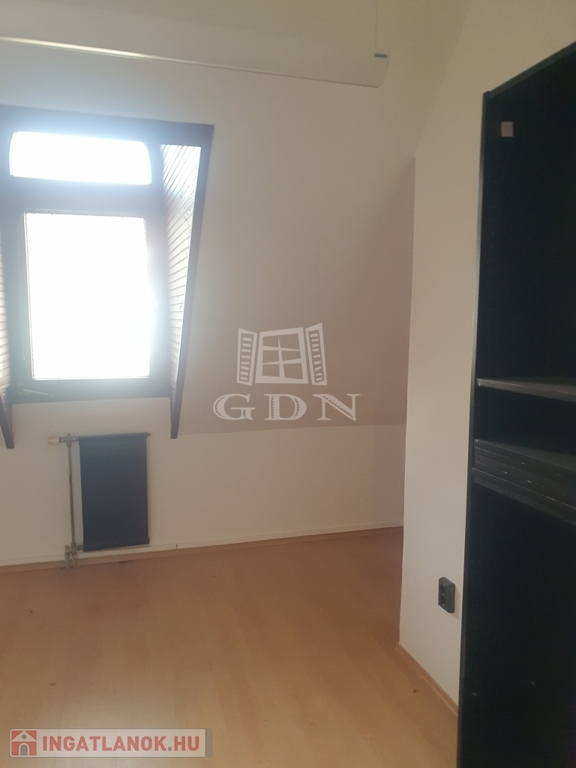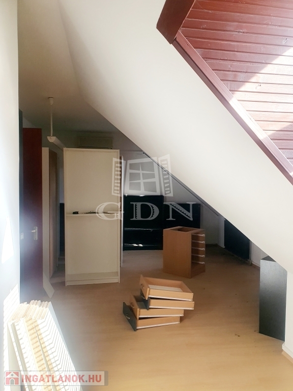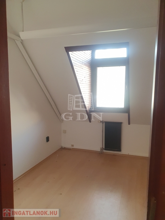 A bérbe vehető iroda az épület tetőterében található, bruttó alapterülete közel 100 nm, hasznos alapterülete megközelítőleg 70 nm, felosztását tekintve négy irodahelyiség, mellékhelyiség, előtér és teakonyha kialakítású. Fűtése és meleg vízellátása gáz-cirko rendszerrel megoldott.