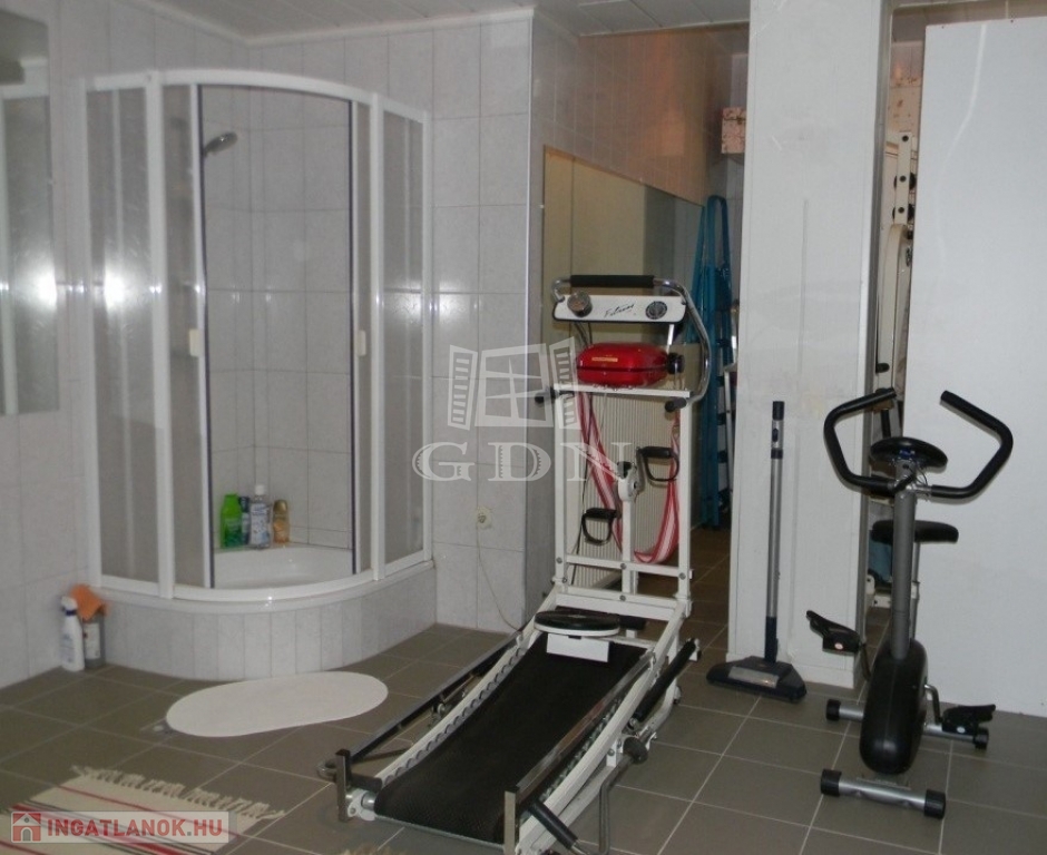 ALAGSOR: 2 állásos garázs mellett, fitness terem, 4 fős szauna, zuhanyzó, külön helyiségben a mosókonyha, gépészeti helység.