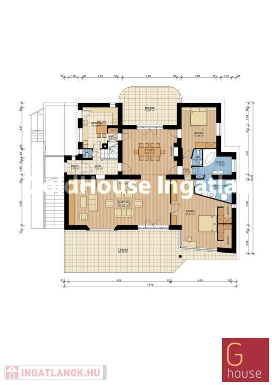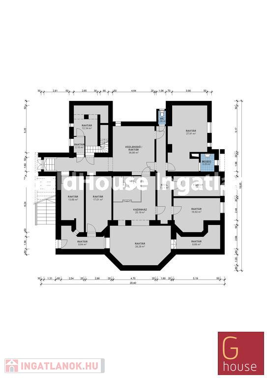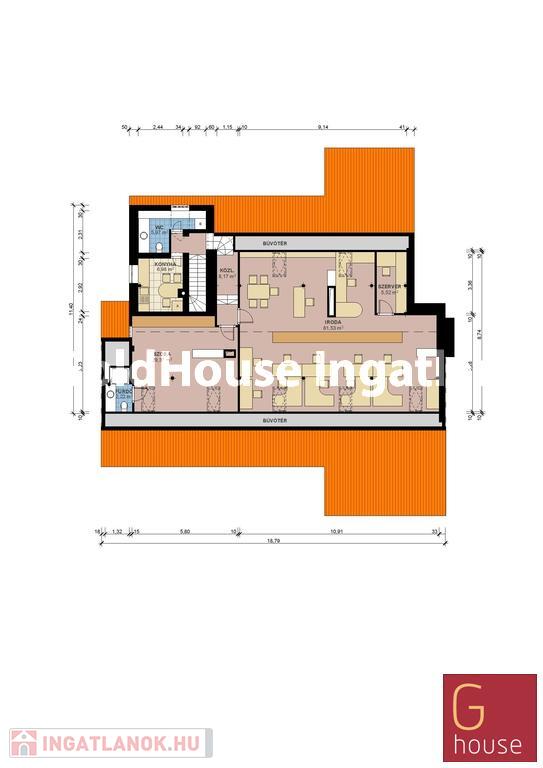 Elosztása: alagsor 221 m2, földszint 197 m2, tetőtér 140 m2. Az épület alagsora elsősorban raktározásra alkalmas, a földszintjén 2 fürdőszoba, 3 szoba, konyha, ebédlő, melynek ajtaja a teraszra nyílik, a tetőtérben pedig 140 m2-es irodaterület került kialakításra hozzá kapcsolódó mellékhelyiséggel, teakonyhával.
