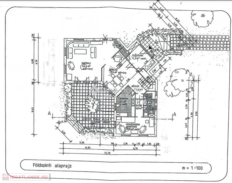 Földszinten nappali, 45 nm -es félig fedett terasszal a kert felé, külön konyha és étkező, 1 hálószoba, kamra, fürdő, wc-vel.