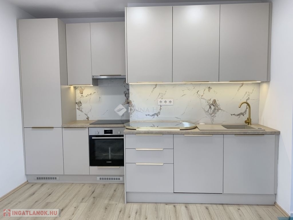 Az elektromos hálózat teljes körű megújítása mellett a lakás egy modern, beépített gépekkel ellátott konyhával büszkélkedhet. A fürdőszoba átalakítása során a legújabb trendeknek megfelelő berendezéseket és burkolatokat választották. A szobákban elhelyezett 12 mm vastag, vízálló laminált parketta nem csak esztétikailag vonzó, hanem praktikus is.