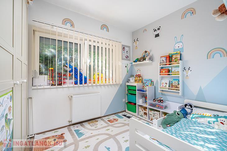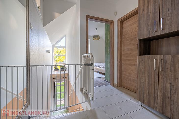 A 2 lakásos társasház 2012-ben épült, a lakás elrendezése pedig jelenleg amerikai konyhás nappaliból, 3 szobából – az egyik szoba jelenleg gardróbszobaként funkcionál - 2 fürdőszobából, egy külön wc helyiségből és spejzből épül fel.
