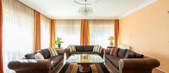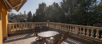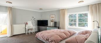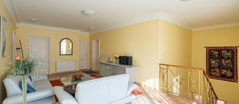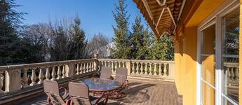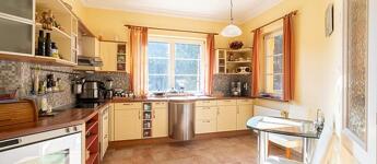 A tágas belső terek 3 méteres belmagassággal rendelkeznek, az ingatlan összesen 8 szobával, 3 fürdőszobával és egy vendég WC-vel szolgálja a család kényelmét. Az alsó szinten egy nagy terasz, míg az emeleten két további terasz biztosít kellemes pihenőhelyet. A konyha prémium AEG készülékekkel felszerelt, a főzéshez indukciós főzőlap és kivezetett szagelszívó áll rendelkezésre.