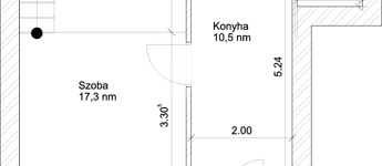 A lakás elosztása: előszoba konyha egyben, konyha végén fürdőszoba nyílik zuhannyal, wc-vel.