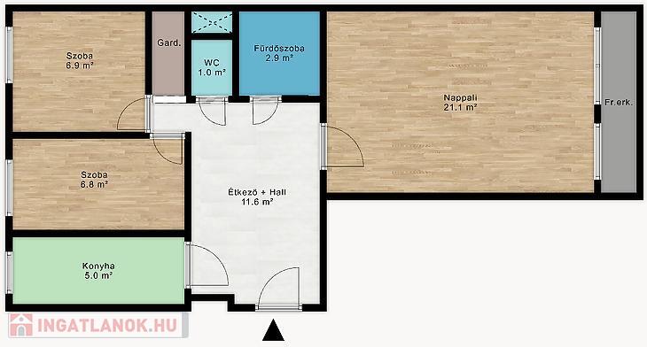 A vizeshelyiségekben járólap, a szobákban pedig modern stílusú parketta található.