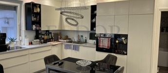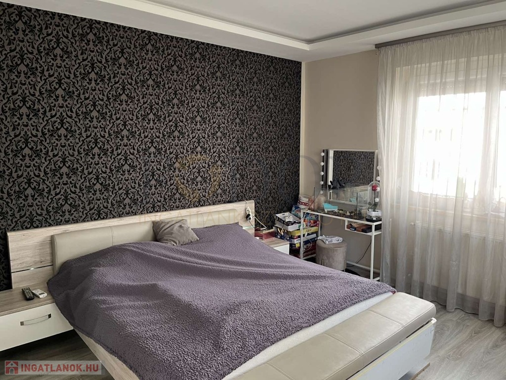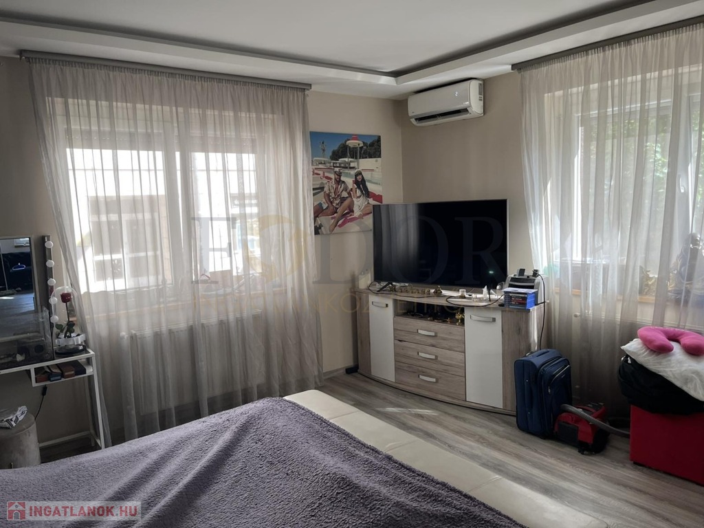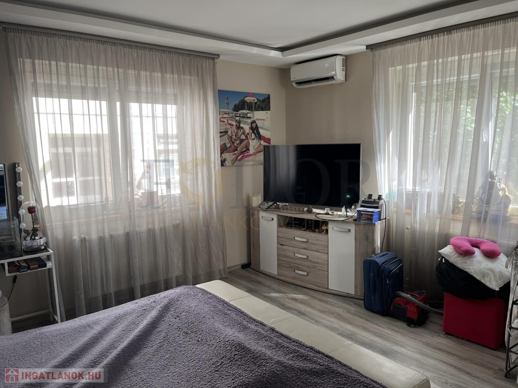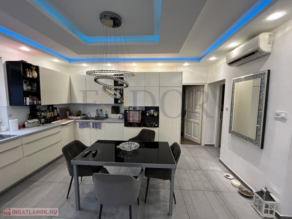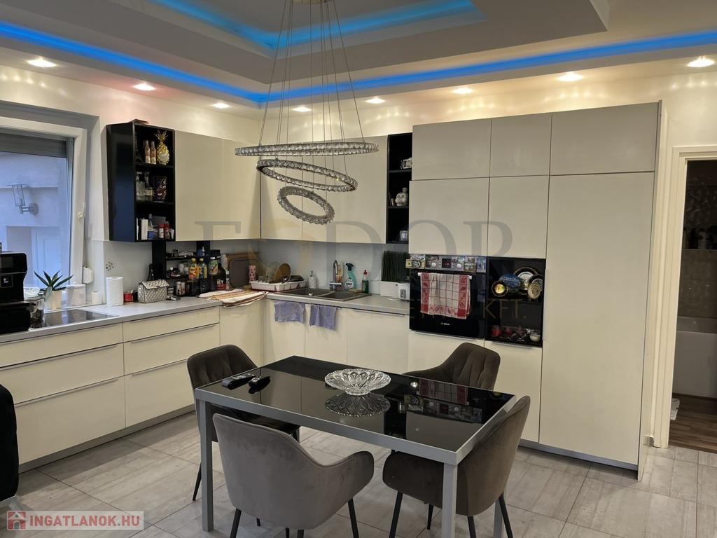 A modern, gépesített konyha beépített berendezésekkel felszerelt. A helyiségek burkolata járólap és laminált padló, a nappali és az egyik hálószoba klimatizált.