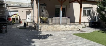 A 440 m²-es saroktelek két utcáról is megközelíthető, parkosított, műfűvel és Viacolor térkővel burkolt, tágas kocsibeállóval, amely két autó számára biztosít kényelmes parkolást.