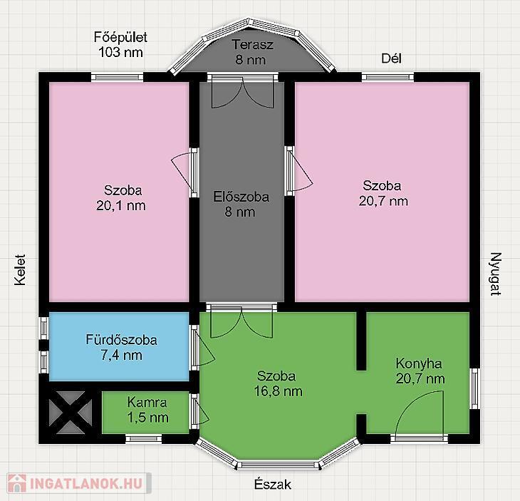 A főépület saját igények szerint alakítható. Redőnnyel felszerelt, fa típusú ablakok vannak beépítve. A szobákban fa parketta és laminált padló a többi helyiségben járólap található. A fűtésről gázkazán, a melegvíz ellátásról villanybojler gondoskodik.