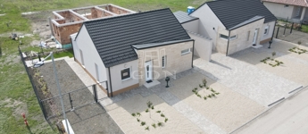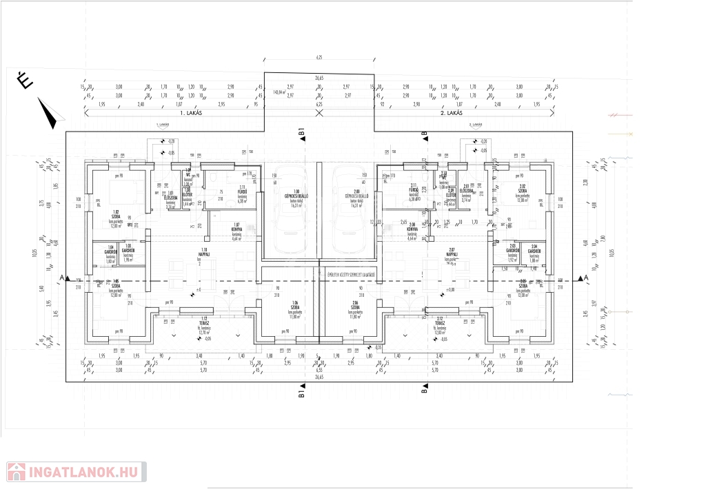 Jászberényben a Szatmári lakóparkban a Bársony utában, 798 m2-es telken, eladó 2db nettó 85,32m2-es + 12,83m2 terasszal és 16,31 m2-es gépkocsibeállóval rendelkező, 30-as Porotherm P30 N+F tégla falazóelemmel épült, fafödémes, 3 szoba plusz amerikaikonyha- nappalis kertkapcsolatos Ikerházfél.