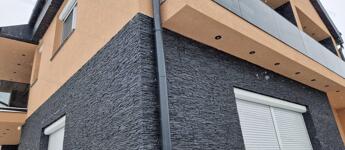 Zalakerámiás kőburkolat az utcafronti kerítésen és oszlopokon,