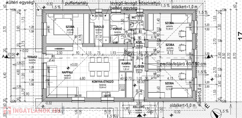 Helyiségek 102 m2-en: amerikai konyhás nappali étkezővel teraszkapcsolattal, kamra, 4 szoba, gépészeti helyiség tárolóval, közlekedő, fürdőszoba wc-vel , wc.