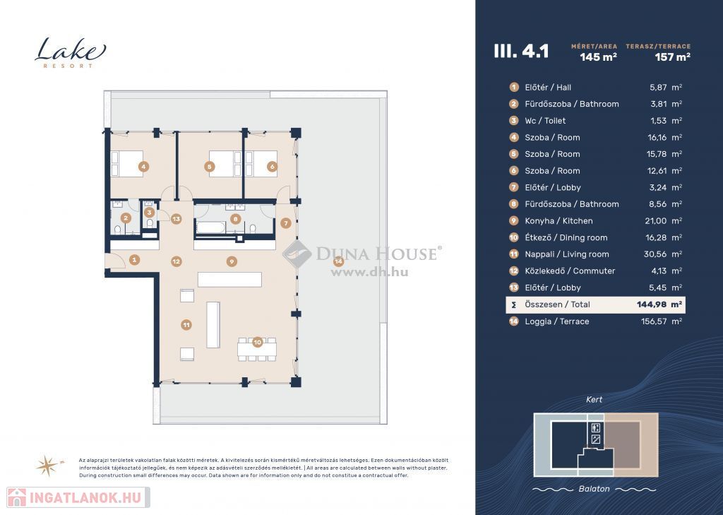 A Lake Resort lakópark Keszthely centrumától délre található Helikon ligetben, a Balaton nyugati oldalán, partközelségben természet közeli környezetben a volt Zala Kemping és Üdülőfalu területén helyezkedik el. Az ingatlan előtt húzódó Entz Géza sétány kerékpárútban végződik, ezáltal az ingatlan zárt szakaszon biztosítja a lakók személygépkocsival való bejutását. A 7,2 hektár nagyságú telek Balaton felőli oldalán ősfás parkosított szakasz nyúlik, a vízparton való pihenéshez, horgászathoz közvetlen móló vagy stég áll rendelkezésre. A déli oldalon húzódó zöld övezet a túrázni, sportolni vágyóknak és kis házi kedvencekkel való sétáláshoz ad tökéletes helyszínt. A tömb északi oldalán a Helikon Horgász Egyesület helyezkedik el.A Lake Resort, projektünk első ütemében 5, a második ütemben 7 házból álló 288 lakásos lakópark kerül kialakításra. A projekt első üteme 2022 első negyedévében kezdődött, kulcsrakész okos megoldással kialakított lakások műszaki átadása 2023 negyedik negyedévétől veszi kezdetét. A telek adta méreteinek és ősfás területének köszönhetően, gondozott parkok, játszó- és sport kertek, tanösvények, piknik/grillezéshez kialakított helyek, privát medencék és saját móló/stég nyújtanak felemelő kikapcsolódási élményeket. A területen megvalósuló Lake Resort lakópark a hely kiemelkedő adottságait kihasználva, könnyed, látványos építészeti megjelenésével harmonikus lakókörnyezetet teremt. Az épületek az Entz Géza sétány felől egy távirányítós rendszerrel ellátott sorompós behajtón, illetve személybejárón keresztül közelíthetőek meg. A lakóházak földszintjén fedett garázs, elektromos autótöltési lehetőség, zárt bicikli és egyéb tárolók találhatók. Az épületek aljában kereskedelmi és szolgáltatóegységek kerülnek kialakításra. A stúdió, közepes és deluxe méretű lakások elsőtől harmadik emeletig szintenként 7-7 lakással, saját erkéllyel lettek tervezve, a felső negyedik szinten pedig összesen három, két penthouse és egy közepes méretű lakás kap helyet privát teraszokkal. Lakásaink között elérhető 30 m2-től akár 150 m2-ig, melyek hozzájárulnak a minőségi életvitelhez és a gondtalan pihenéshez. A Lake Resort Lakópark négy szinten három különféle méretű lakást kínál az érdeklődők számára. Célunk, olyan lakások, otthonok és nyaralók kivitelezése, melyek erkéllyel/terasszal, klimatizált, prémium minőségű alapanyagokkal, modern 21. századi műszaki technológiával épülnek. Valamennyi lakáshoz földszinti fedett garázs és tároló is igény szerint vásárolható. Igényeihez igazodó lakását még ma találja meg, további kérdéseivel keressen bizalommal.