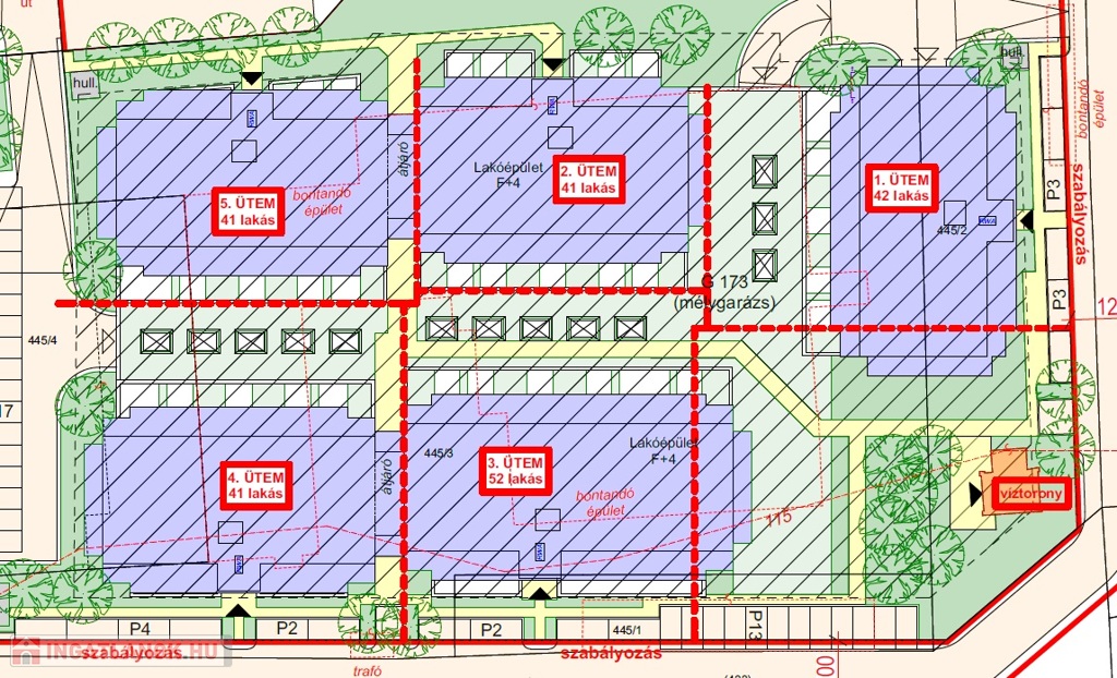 Ezek alapján az előzetes számítások szerint, 4 színt esetén kb. 22.000 nm nettó értékesíthető felületet kapunk, ami átlagosan nettó 60 nm alapterületű lakásokkal számolva kb. 366 lakás. Így tehát a jelenleg beépíthető 7.841.6 nm terület alapján min. 300 db. mély-szinti bruttó 25 nm teremgarázs lesz építhető.
