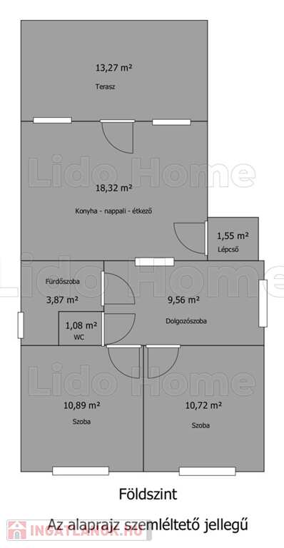 - földszint: amerikai konyhás nappali – étkező, teraszkapcsolat, 2 hálószoba, dolgozószoba, fürdőszoba, WC