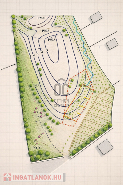A tó felőli oldal szomszédságában vízmű védterület található, enyhe lejtésekkel.