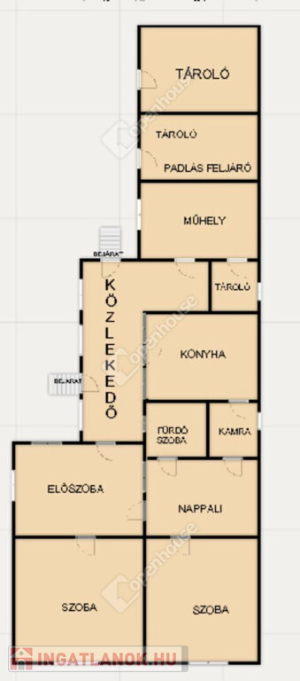 Belső elrendezése jelen kialakításában: bejárat két irányból adott, közlekedő, előszoba, két kényelmes méretű külön nyíló szoba, nappali, fürdőszoba, kamra, konyha, műhely, tároló.
